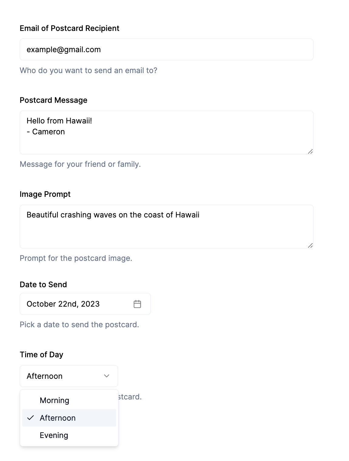 - A user fills out a form with an email address for the recipient, a body message for the email, a prompt for the image, and sets a date and a time of day to send the postcard.