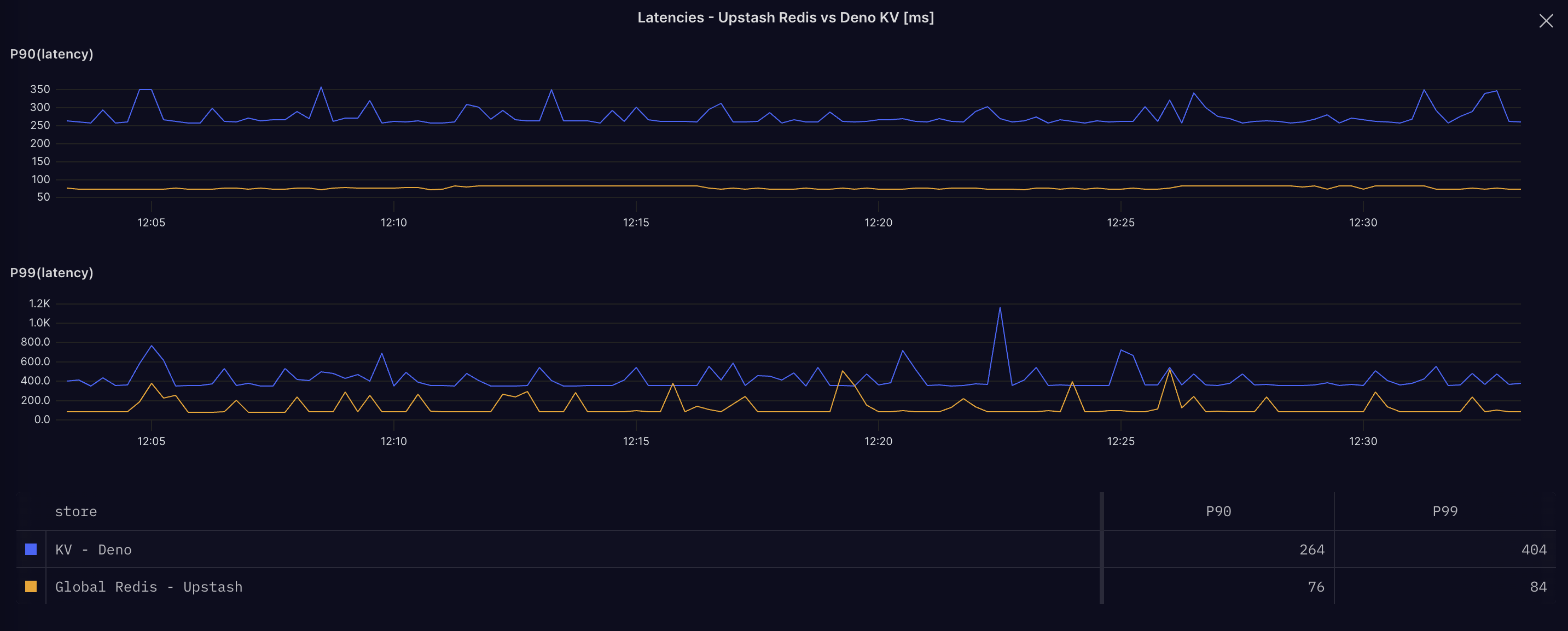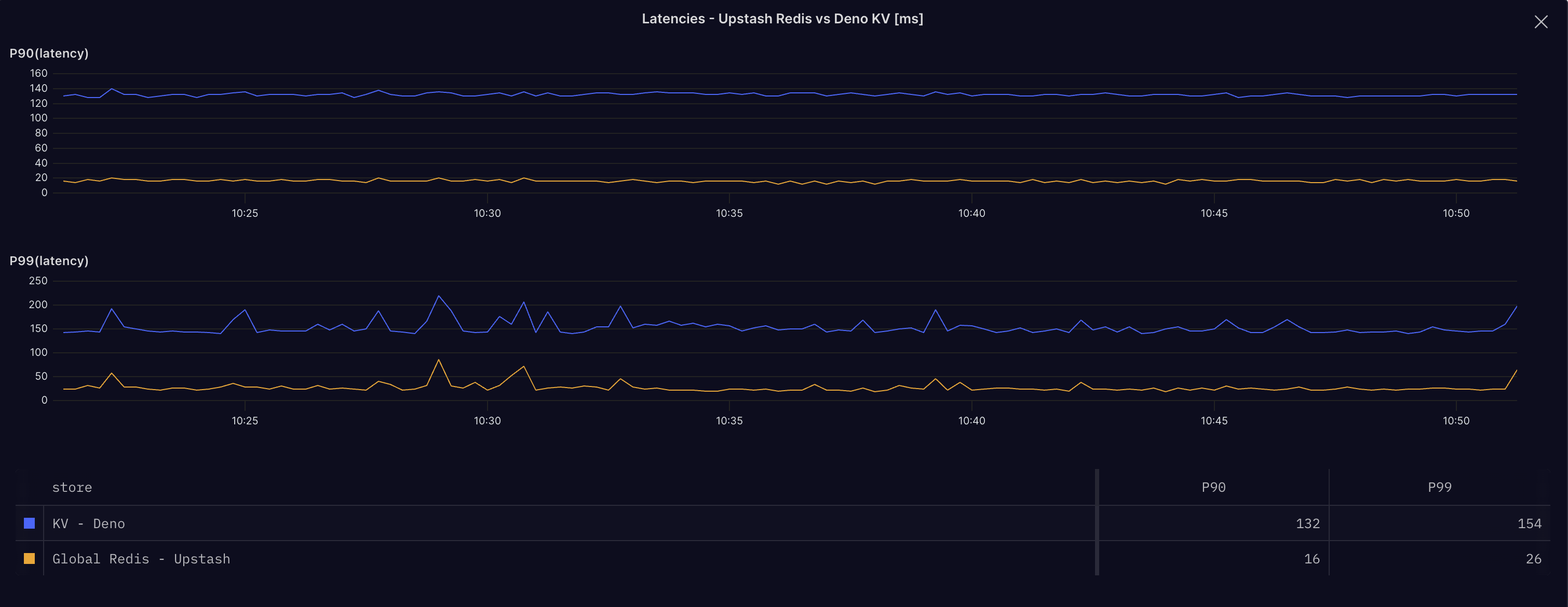 After 30 minutes, here are the results. The latency measured here is just from the function on Deno Deploy to the store, not including network roundtrips to invoke the function.