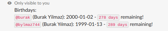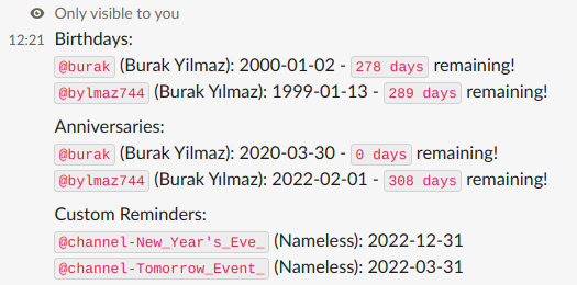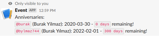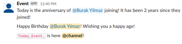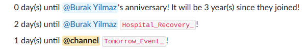 • Posts to the general channel once the event anniversary comes, mentioning the person in the center of the event (or everyone in the channel).