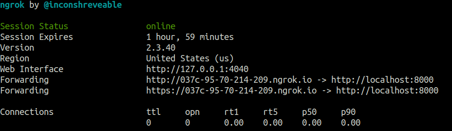 ./ngrok http 8000 --> Tunnels your localhost:8000 ngrok