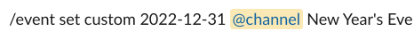 • /event set custom <YYYY-MM-DD> <user> <any kind of message with whitespaces>