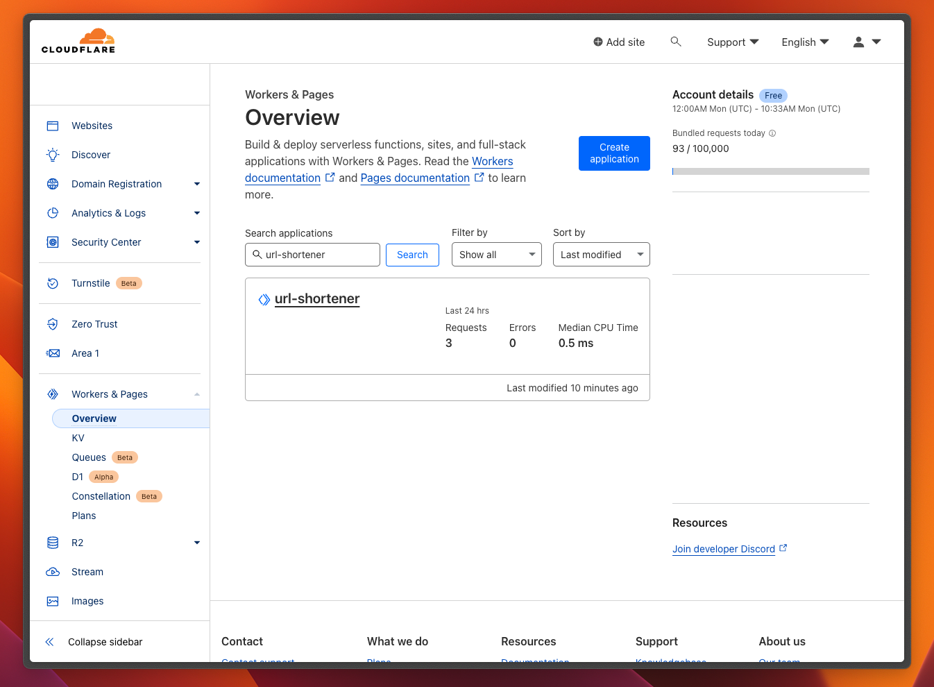 Access to the Cloudflare Dashboard and login with the same account that you've created the url-shortener application. Then, navigate to the Workers & Pages > Overview section of the sidebar. Here, you will find the url-shortener application listed.