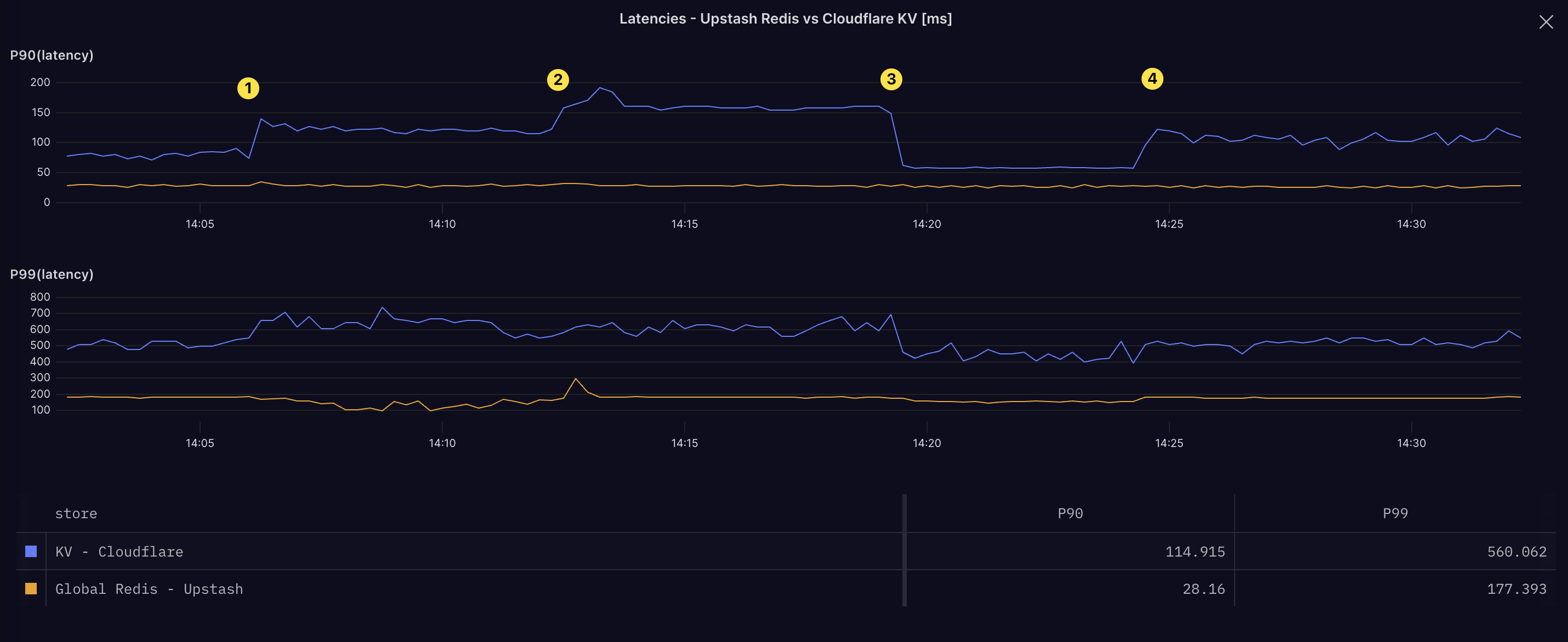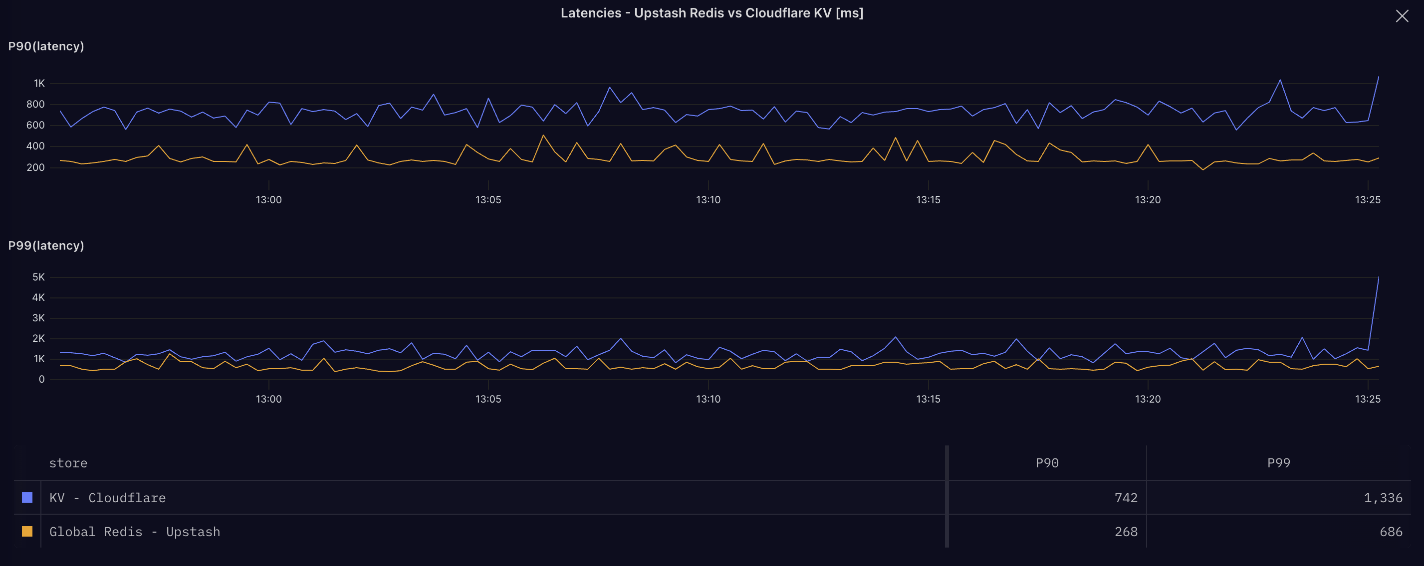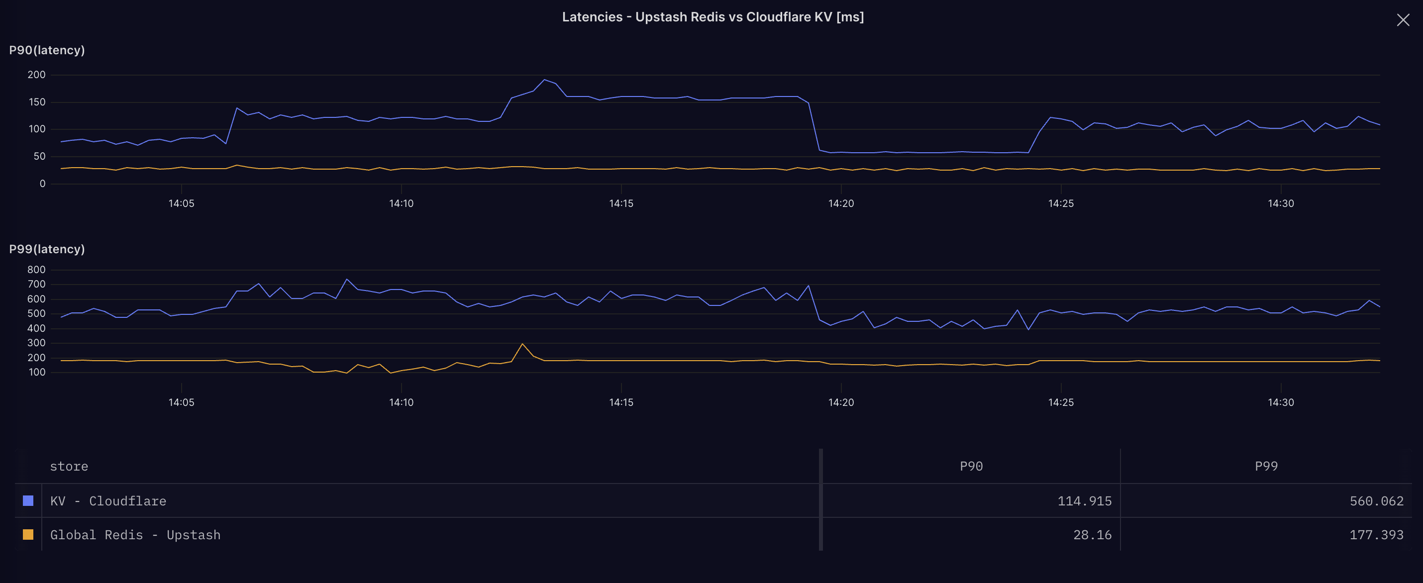 If you're running a small to medium sized API, then you will need to consider latency as the cost will be negligible. When the API has heavy traffic, Upstash offers fixed pricing which is cheaper then Cloudflare KV.