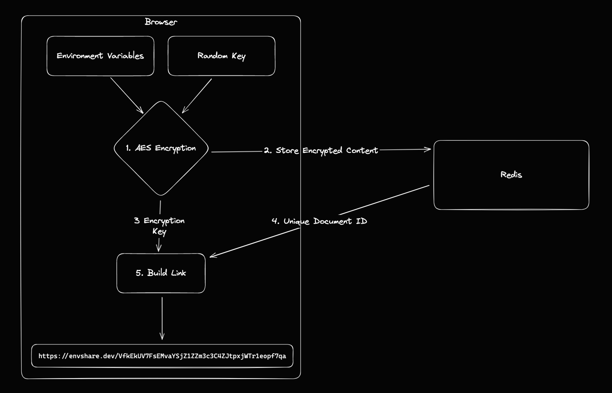 Every time you want to share your environment variables, a new random encryption key is generated in the browser. Your sensitive data is encrypted using AES and then stored in Redis.