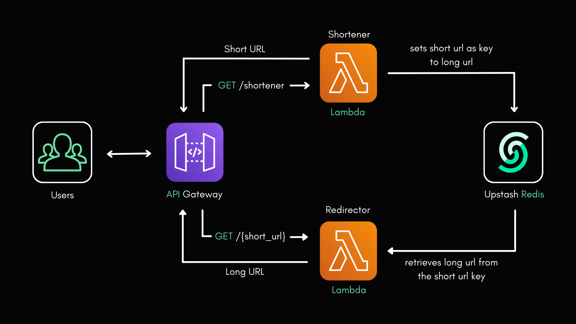 The project consists of one database on Upstash Redis, two Python Lambda functions, and an API Gateway on AWS. Users may use either the web interface or the API to consume the shortener service.