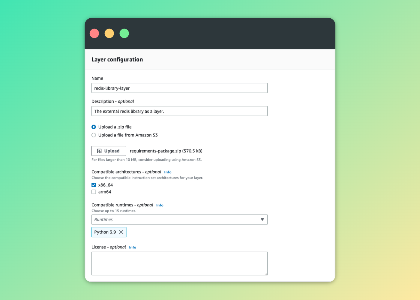 zip -r requirements-package.zip pythonThen, go back to the shortener function on AWS and direct to Layers from the sidebar. Click on the Create layer and fill in the needed configuration and upload the requirements-package.zip file, just similar to mine.