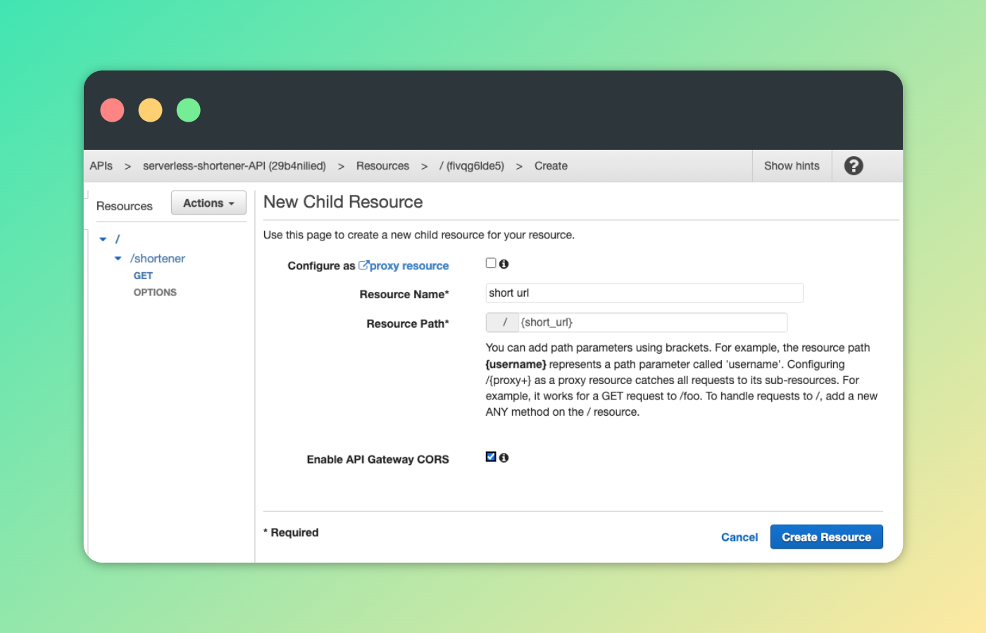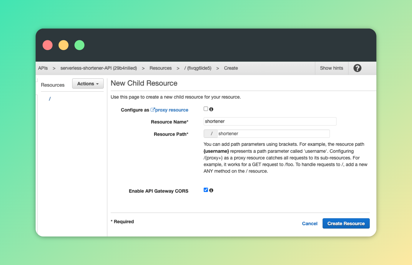 We have connected the shortener function to our API, so we can now shorten our URLs. However, we need the redirector Lambda function connected to the API for our service to work. Click on the / in the Resources, head to Actions > Create Resource.