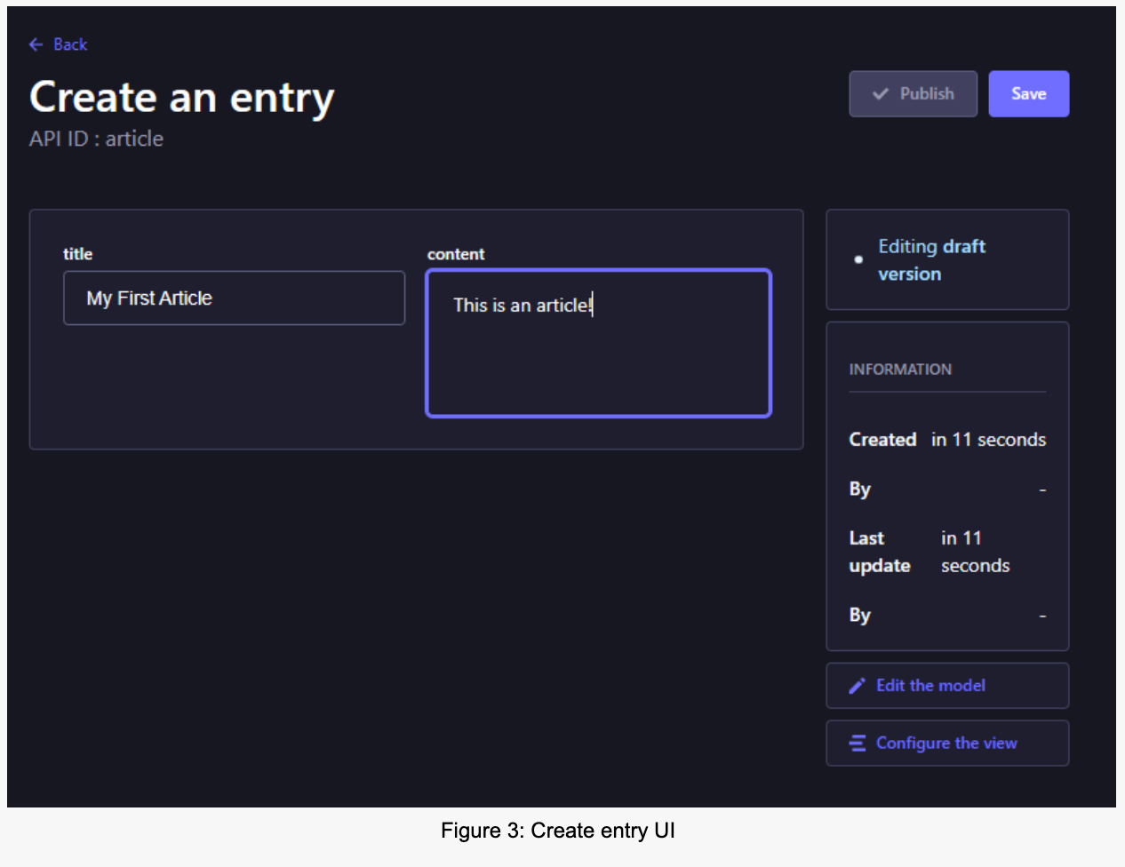 In figure 3, you can see the new content entry UI. Don’t forget to click on the “Save” and the “Publish” button; otherwise, you will have a private draft that isn’t accessible via the public API.