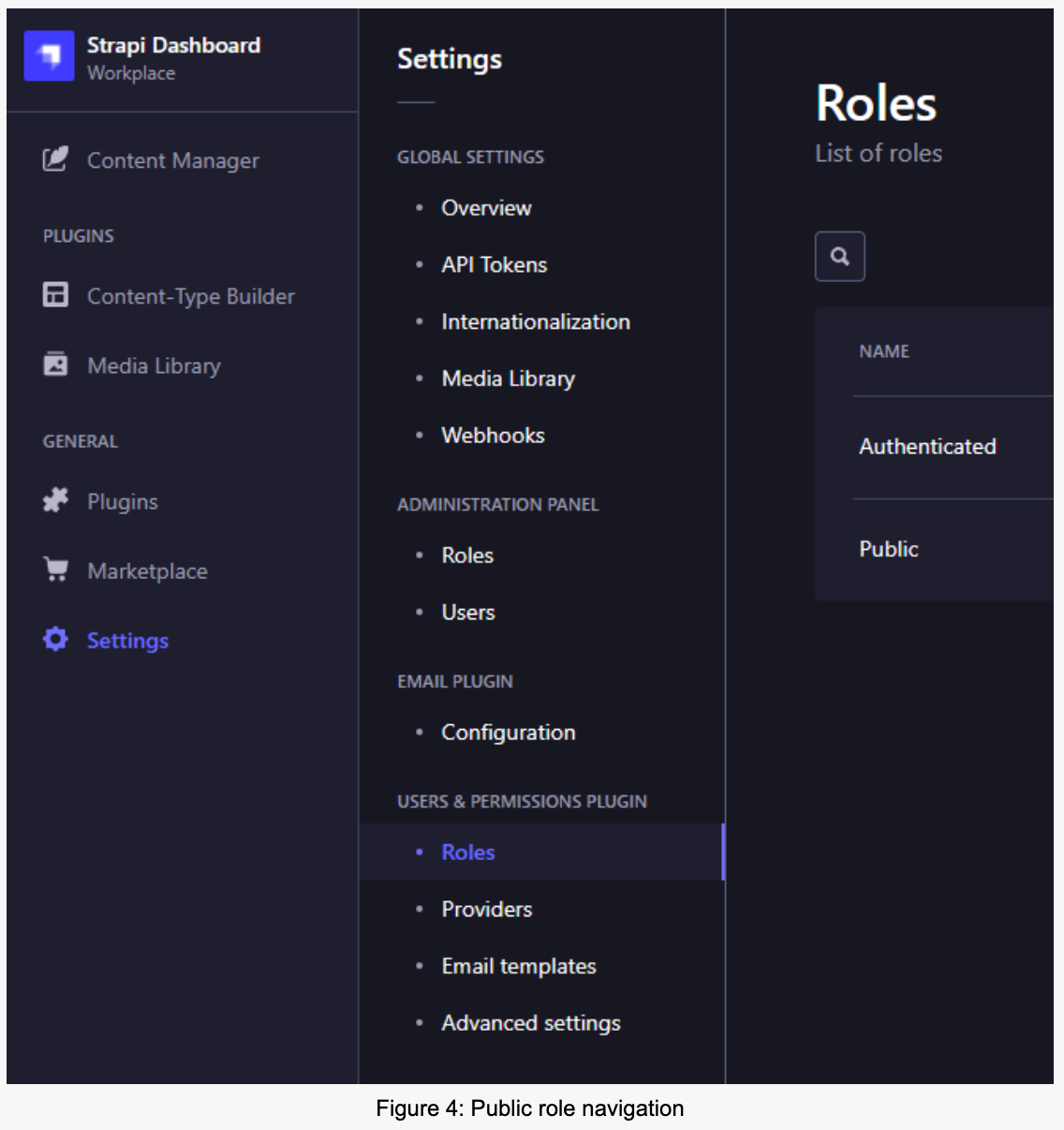 We have an article type and an actual article, but it isn’t accessible to the public. To change this, we need to update the public role. Figure 4 shows where you can find it in the navigation.