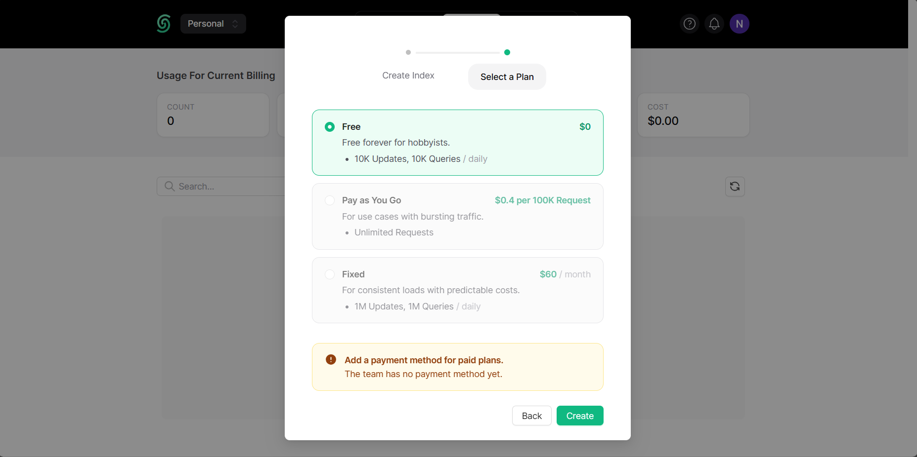 Then pick your plan as you like and click Create.