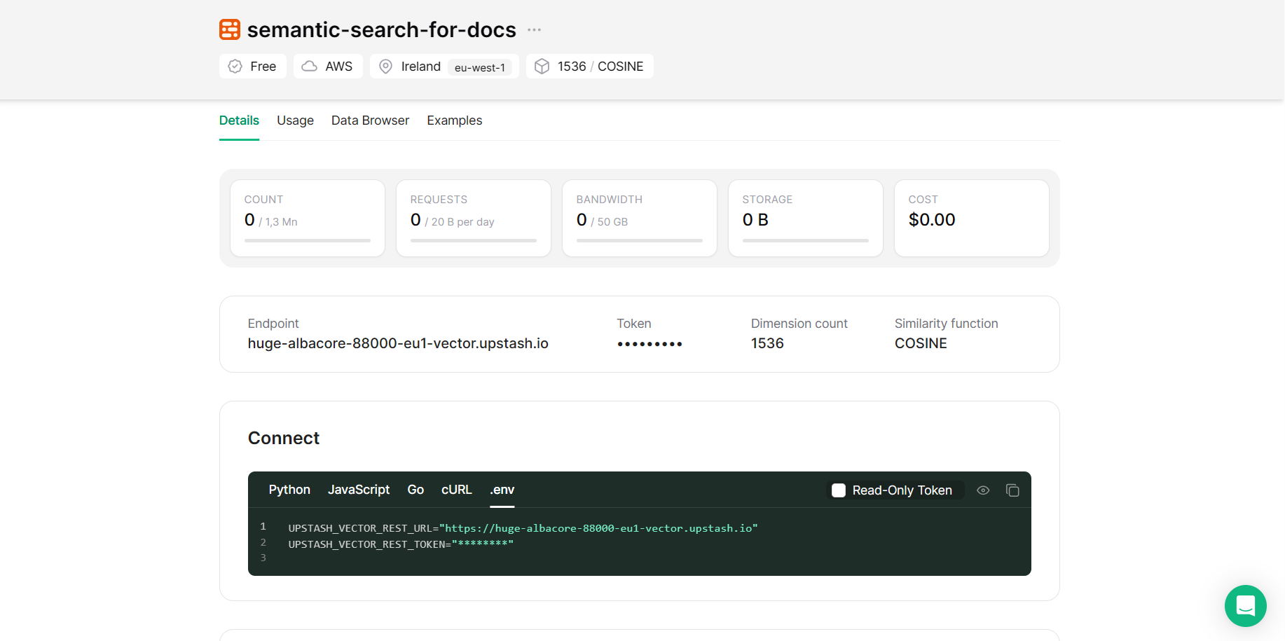 Now create a file called .env in your project and add it to the .gitignore file if you are considering to add this project to your Github account. In this file, we will store our API keys. To get your Upstash Vector keys go to the database you created, switch to the tab Details and copy the content under .env tab as in the image.