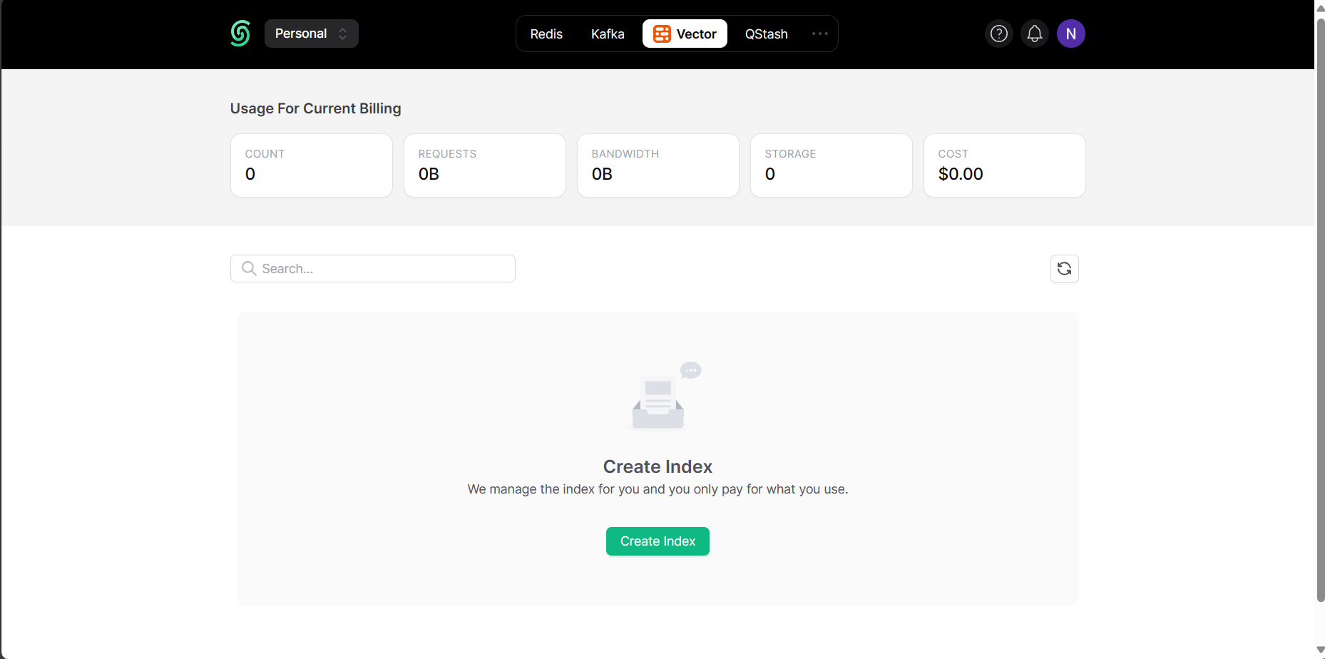 Navigate to Upstash Console and create an account if you don't have already. Then, login to your account and go to Vector using the bar at the top of the page. After that click Create Index.