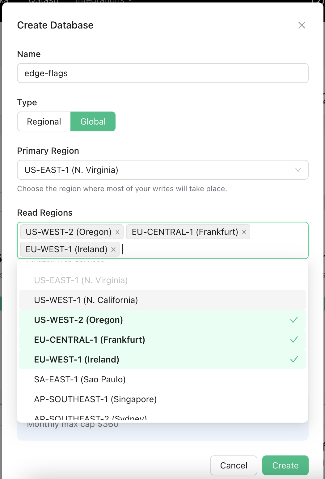 Create a Redis database on Upstash Console. For best performance, select global and the regions that users likely to be.